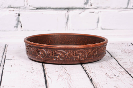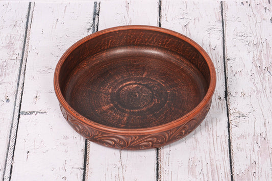 Georgian Frying Pan Ketsi Hand Engraving Unglazed Handmade Clay Plate Ceramic Dish Handcrafted Brown Round Plate 7in | 18cm